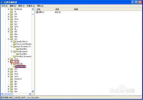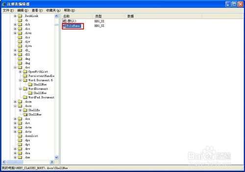 在注册表编辑器中依次打开:HKEY_CLASSES_ROOT——.docx,右击docx,选择新建——项,命名为“ShellNew”,右击ShellNew,选择新建——字符串值,命名为“FileName”。