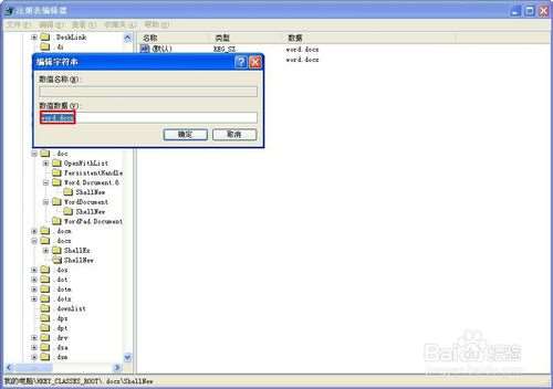 双击FileName单开属性,在数值数据中填入“word.docx”,同时双击默认打开其属性,在数值数据中填入“word.docx”。这时候就添加好了。