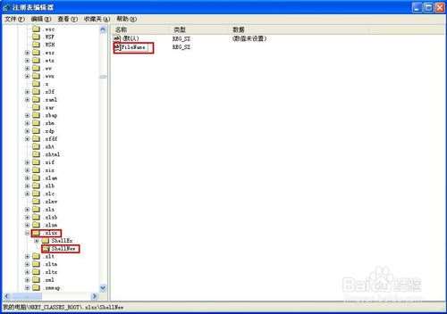 用同样的方式,在注册表编辑器中依次打开:HKEY_CLASSES_ROOT——.xlsx,右击xlsx,选择新建——项,命名为“ShellNew”,右击ShellNew,选择新建——字符串值,命名为“FileName”。双击FileName单开属性,在数值数据中填入“excel.xlsx”,同时双击默认打开其属性,在数值数据中填入“excel.xlsx”。
