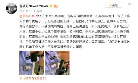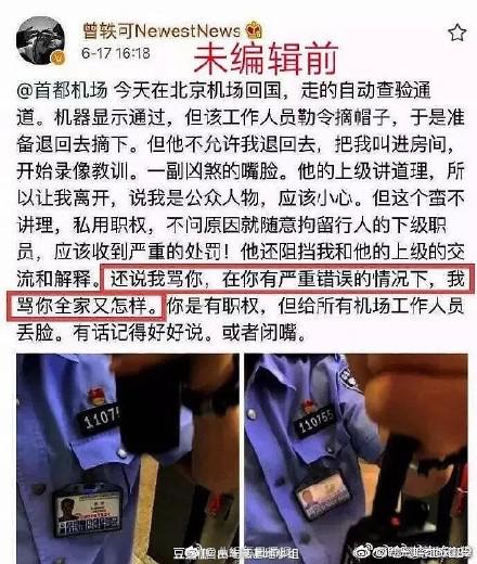 6.17日下午,歌手曾轶可发微博表示自己在首都机场遭遇工作人员刁难,并在微博中挂出了工作人员的工作照,要求处理该工作人员。