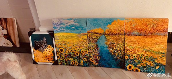 从她晒出的多幅油画来看,其中有两幅分别是小猫被黄花包围,还有一张则是满满向日葵的风景画,非常漂亮。不过这两幅画都没有署名。