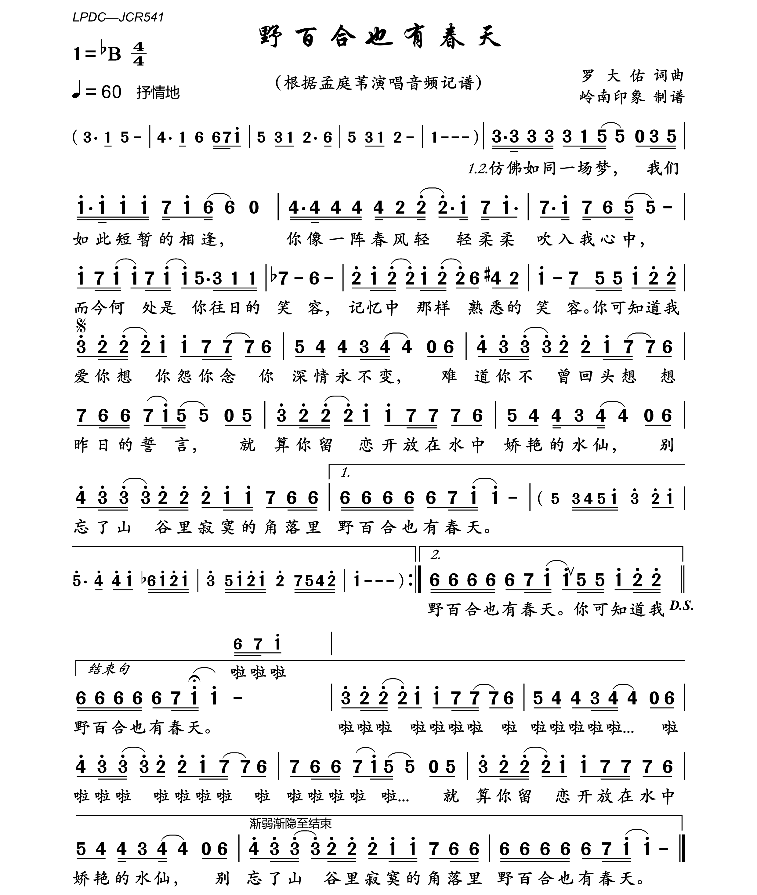 野百合也有春天简谱-曲谱-歌词 曲谱自学网今天精心准备的是《野百合也有春天曲谱》,下面是详解! 野百合也有春天 《野百合也有春天》文本歌词 野百合也有春天 演唱:孟庭苇 仿佛如同一场梦 我们如此短暂...[详情]分类:简谱大全时间:14:17