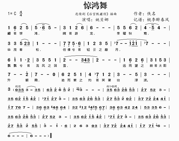 惊鸿舞简谱-曲谱-歌词 曲谱自学网今天精心准备的是《惊鸿舞曲谱》,下面是详解! 惊鸿舞 惊鸿舞 (《甄嬛传》电视剧插曲) - 姚贝娜 (Bella Yao) 词:曹植(魏) 曲:刘欢 编曲:孟可 翩若惊鸿 婉若...[详情]分类:简谱大全时间:14:51