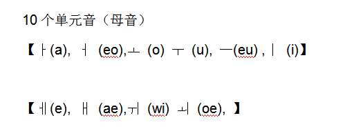 单元音8个:ㅏ[a]、ㅓ[eo]、ㅗ[o]、ㅜ[u]、ㅡ[eu]、ㅣ、ㅐ[ae]、ㅔ[e]